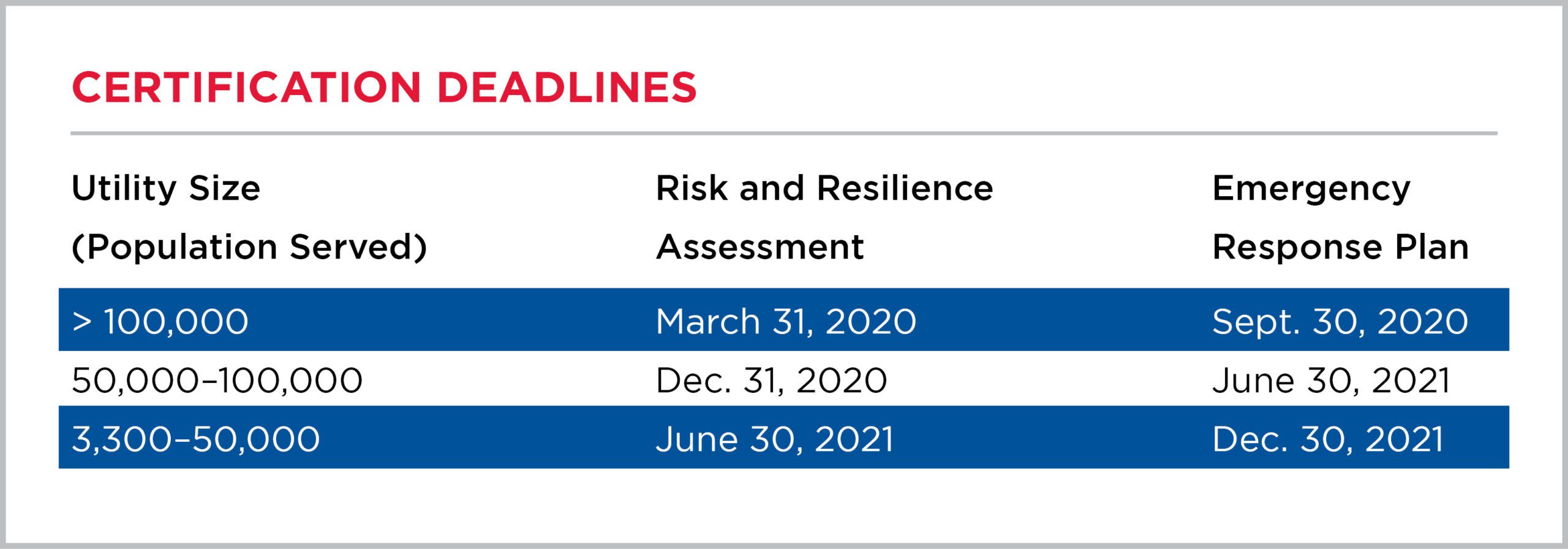 The table below shows the deadlines for certification of completion of the risk and resilience assessment and the emergency response plan by the size of the population served.